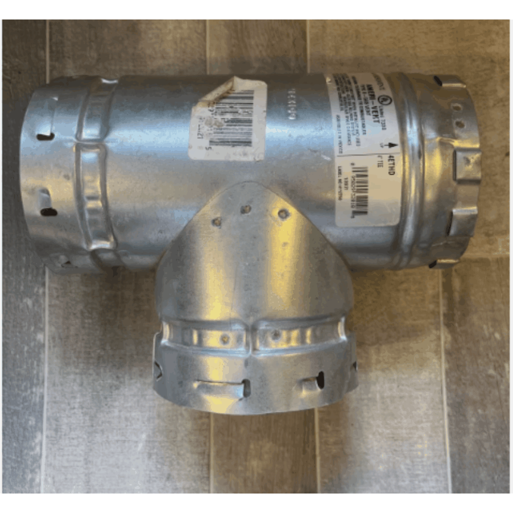 Standard Tee Pipe with a 4 in. diameter and 10 in. length, designed for use with Type B gas vent systems. Features a Snaplock coupling end type for secure connections. Built to withstand high temperatures ranging from 400°F to 550°F. Dimension B measures 4-1/4 in.