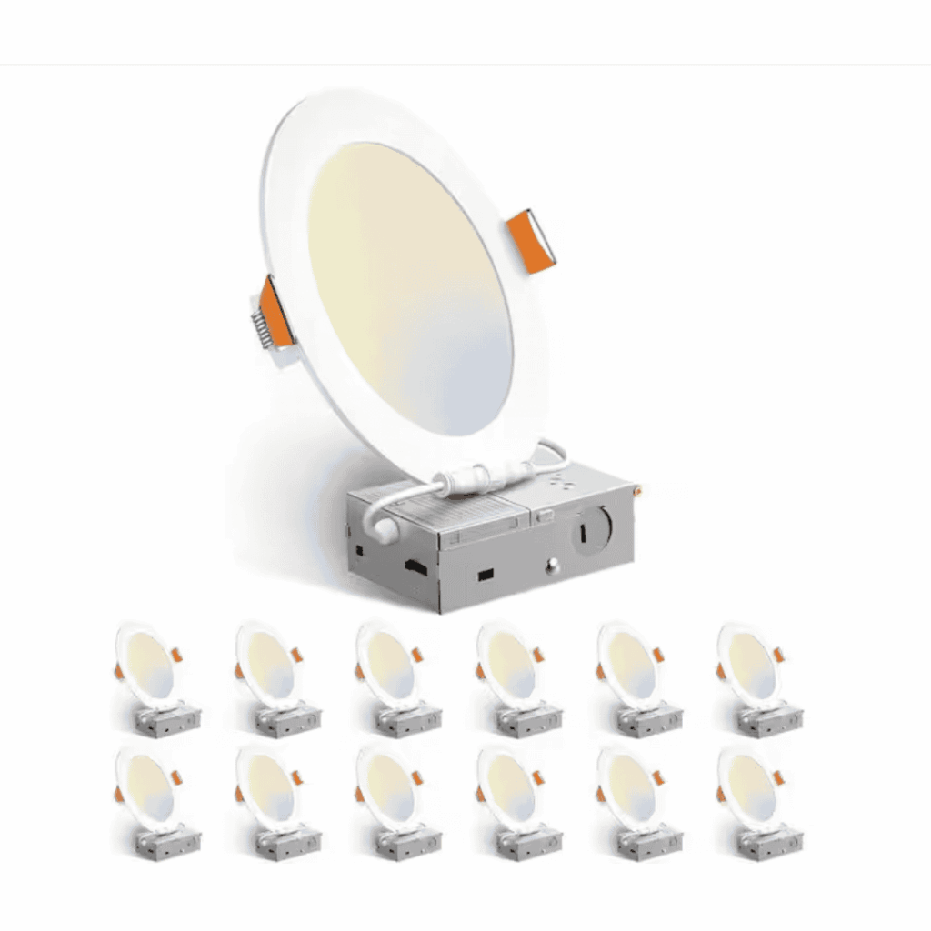 Upgrade your space with this 12-pack of 6 in. Ultra-Thin LED Recessed Lights, perfect for modern homes and commercial spaces. Each light features 5 selectable color temperatures (2700K–5000K), allowing you to customize the ambiance. With a high CRI of 90, these lights provide vivid, natural illumination that enhances any environment. The ultra-thin design enables easy installation in tight spaces without requiring an insulation box. Dimmable compatibility with most switches (not included) lets you create the perfect lighting for any setting. Energy-efficient and eco-friendly, these lights are ideal for living rooms, kitchens, offices, or retail spaces.