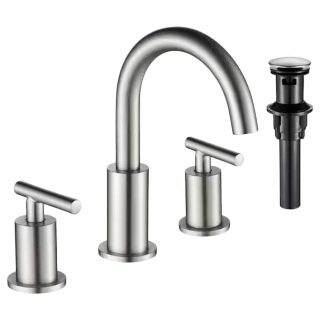 Upgrade your bathroom with the Androme 8 in. Widespread Double Handle High-Arc Bathroom Faucet in Nickel. Crafted from durable stainless steel, this faucet resists corrosion, leaks, and drips for over 500,000 uses, ensuring long-lasting, contaminant-free water for your family. Designed for easy installation and precise flow and temperature control, it combines contemporary style with reliable performance to enhance any bathroom decor.