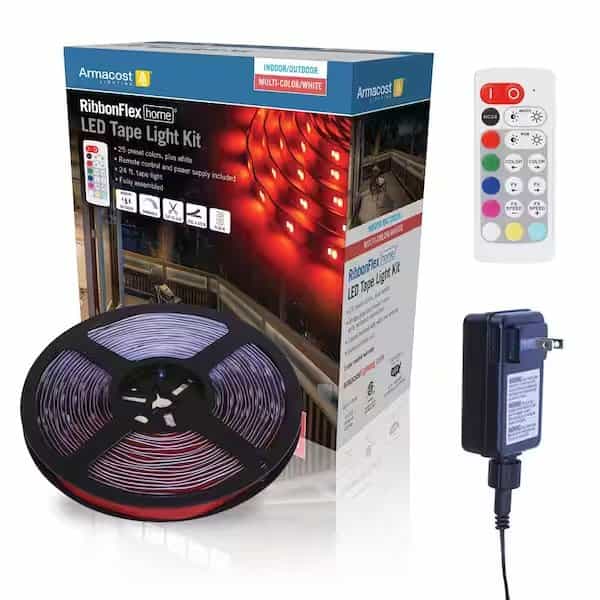 The Armacost Lighting RibbonFlex Home Multi-color RGB plus White LED strip light kit is the perfect solution for versatile indoor or outdoor accent lighting including under cabinets, shelving, decks and patios. Full-range brightness and color control with included wireless remote, RF technology works through walls up to 50 ft. away. Adhesive backing for easy installation. For indoor and outdoor use.