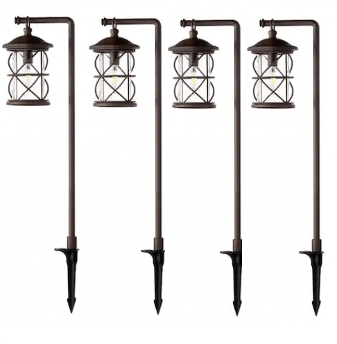 This Hampton Bay Outdoor Path Light provides the same bright light as a typical halogen landscape light, but uses over 80% less energy. The path light is supplied with a 1.36-Watt replaceable authentic vintage filament LED light bulb. Combination of the LED filament lamp and seedy glass create a warm and inviting atmosphere in your landscape. The Rustic Bronze finish has the look and feel of natural aged iron. Top-quality features include cast-aluminum construction, a long-life powder-coat finish, weatherproof electronics, and a quick-install wire connector. Do-it-yourself installation is fast, easy, and safe. This fixture’s light creates a beautiful pattern of soft light that can illuminate steps, pathways and smaller plants, offering a valuable outdoor security feature for your home.