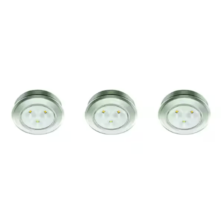 These versatile LED puck lights provide bright, convenient lighting with easy installation. Simply press to turn them on or off. Attach them to almost any surface using the included double-sided adhesive tape or secure them more permanently with the provided mounting screws. Each puck light is battery-operated, delivering 60 lumens of soft white (3000K) illumination. Designed for durability, the long-lasting LEDs require no bulb replacements. Ideal for under-cabinet lighting, closets, hallways, or any space needing extra light without the hassle of wiring. Sold in a pack of three.