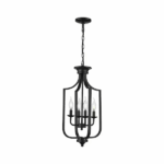 Enhance your kitchen, dining room, or foyer entryway with the classic styling of this four-light pendant from Bel Air Lighting. The sleek and gracefully curved metal cage highlights a rustic, industrial appeal while the exposed candelabra candle-stick style bulbs give it a traditional feel. The matte black finish will coordinate with a variety of interior decor styles, and is designed to blend seamlessly with existing light fixtures. The vertical pendant body hangs from a matching black chain and round ceiling canopy, offering height adjustability and sloped ceiling compatibility. With a variety of colors and size options to choose from, this stylish pendant series will put the finishing touch in any room of the home.