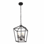 Add timeless elegance and rustic charm to your home with this black pendant chandelier. Crafted with a sturdy wrought iron frame and a sleek brushed black finish, its geometric open-cage design creates a striking focal point for any space. The chandelier’s four candle-style lights deliver warm, inviting illumination, making it ideal for dining rooms, kitchens, foyers, and living areas. Designed for versatility, it complements both classic and modern interiors while providing style and functionality in one refined fixture.