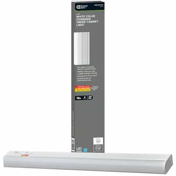 Commercial Electric 18in. Plug-in LED Under Cabinet Light is designed to replace over-heated under cabinet incandescent, puck and xenon lights with an energy-efficient LED fixture. Under cabinet lighting is aesthetically pleasing and not only will it improve the brightness and overall ambiance of your kitchen, but it can also increase the resale value of your home. This under cabinet offers several lighting options to customize brightness levels. At any time, using slide switch, select between Warm White, Soft White, Bright White plus choose Low or High intensity for dimming or toggle center to turn off fixture. Our 18in. size is perfect for larger cabinet widths and is linkable up to 25 units. With a lifespan of up to 50,000 hours, our LED under cabinet light is maintenance free with absolutely no bulbs to replace. Perfect for kitchen preparation, underneath cabinets, under desk-hutch, workstations, cabinet unit, shelving, workbench, closet or accent lighting.