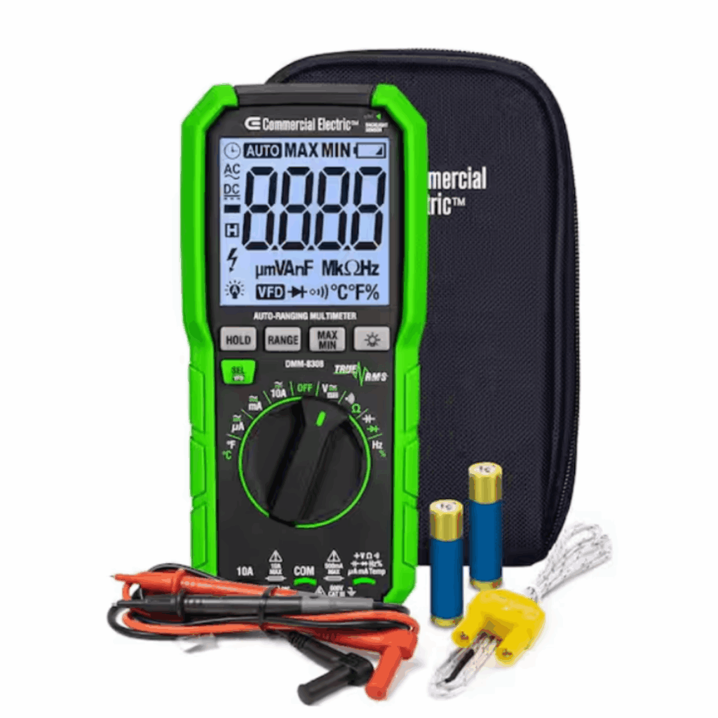The Commercial Electric 600-Volt True RMS Slim Auto-Ranging Digital Multimeter (DMM-8308) is designed for accuracy, durability, and ease of use. This True RMS multimeter measures AC/DC voltage, AC/DC current, and resistance, as well as temperature, capacitance, frequency, duty cycle, diodes, and continuity. Built with input from professional electricians, it combines innovative, time-saving features with a rugged design made for real-world job sites.