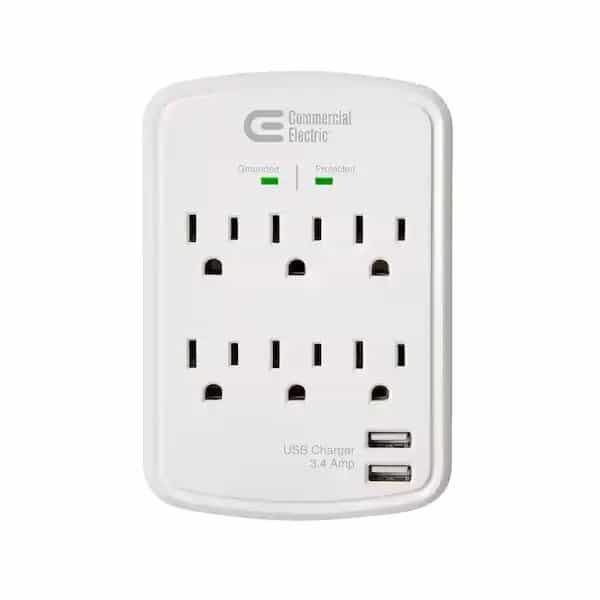 The CE 6-Outlet USB Wall Tap Surge Protector is ideal for locations with limited space where your electronics need protection from power surges and spikes. This surge protector has 1,200 joules of protection, 2 USB charging ports with 3.4 Amps and a convenient wall tap plug. Protects personal computers, wireless/VOIP routers, cable/DSL modems, tablet chargers and other personal electronics.
