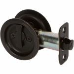 The Delaney Hardware black round sliding pocket door lock provides a quick and easy way to operate a pocket door. This specific pocket door lock flush mount design requires a standard door prep with a 2 1/8 in. hole in the door commonly referred to as a crossbore. The flush mount design and recessed thumb turn allows proper clearance in door pocket and operates latch in the door opening. The privacy function is commonly used on bed/bath installations where locking is required.