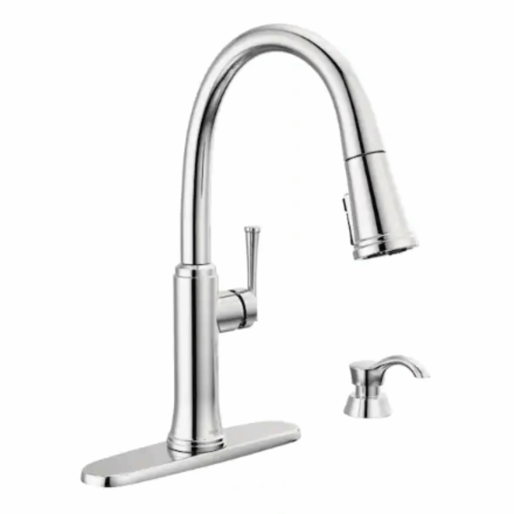 The Eldridge Kitchen Faucet blends classic elegance with modern innovation, offering a timeless design that enhances both style and functionality. Featuring Delta MagnaTite Docking, the pull-down sprayer locks securely into place with a powerful magnet, preventing sagging over time. ShieldSpray Technology delivers a concentrated jet for tough messes while reducing splatter for a cleaner workspace. Built with Diamond Seal Technology, this faucet minimizes leaks and ensures long-lasting performance. Designed for versatile installation, it includes a coordinating soap dispenser and an optional deck plate for a seamless look.