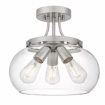 Enhance your home lighting with this 3-light brushed nickel semi-flush mount fixture. It features a clear glass shade that maximizes light output while offering a sleek, modern touch. The brushed nickel finish suits a variety of interior styles, from contemporary to transitional. Ideal for hallways, kitchens, or living spaces, this semi-flush mount combines style and practicality. Its streamlined design fits effortlessly into any room, elevating your space’s overall look.