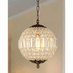 This globe crystal chandelier combines timeless elegance with functional design, offering a refined vintage aesthetic. The fixture features a sturdy metal frame intricately wrapped in handcrafted crystal wire, adding rich texture and a warm, inviting glow. Available in three sizes—12 in., 20 in., and 24 in. diameter—it includes a 59 in. adjustable chain and a canopy compatible with sloped ceilings, making it a versatile lighting choice for any room.
