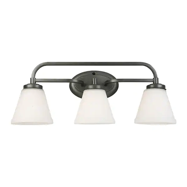Light up your bath areas with the Mayview Three Light Bath Light by Eglo . This simple but elegant bath light has a dark, graphite finish with down turned frosted glass shades. Incandescent bulb lighting creates a bright but soft luminescence in any room or bath area. Bulb not included.
