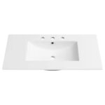 The Eridanus 36 in. x 18 in. vanity top with integrated sink offers a modern upgrade to your bathroom. Its natural, smooth lines provide a comfortable and visually appealing grooming experience. Made from durable, non-porous vitreous china, the surface resists yellowing, cracking, polishing wear, and damage. The integrated design maximizes counter space, while the 8 in. faucet hole spacing accommodates standard alternating hot and cold water installations.