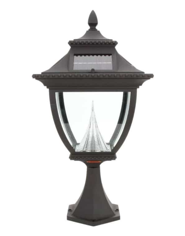 Inspired by the architecture of Eastern Asia, the Gama Sonic Pagoda Solar Black LED Post Light is a great energy- and money-saving replacement for electric or gas-powered outdoor lighting on flat surfaces like columns and deck posts. This rust-resistant, cast-aluminum design features a powder-coated black finish and real glass panes. Simply secure it to flat surfaces with no electrical wiring needed due to its solar-powered design. The internal lithium ion battery pack charges when sunlight hits the fixture’s four integrated monocrystalline silicon solar panels protected by weather-resistant, cleanable tempered glass that helps ensure long-lasting reliability. The fixture is designed for dusk-to-dawn operation, so at dusk, eight bright white LEDs turn on automatically and shine at 180-Lumens in high brightness mode. If the battery isn’t getting enough sun to charge fully, just switch the brightness mode to low to extend duration. In either mode, Gama Sonic’s patented cone reflector enhances light dispersal and glow to provide beautiful illumination.
