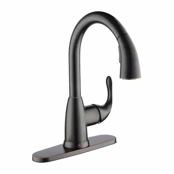 This Glacier Bay Dylan Single-Handle Pull-Down Sprayer Kitchen Faucet boasts a powerful TurboSpray setting for your toughest cleaning tasks. The exclusive feature provides focused water columns with 30 percent more power than standard pull-down faucets. This modern single-handle kitchen faucet enables easy and precise water temperature control, while providing a 1.8 GPM flow rate for outstanding water flow. Its ceramic disc cartridge ensures drip-free performance. Get ample kitchen space from its high-arc spout and a timeless look with its bronze finish and curved minimalist design. Installation is quick and easy with this kitchen faucet’s FastMount system.