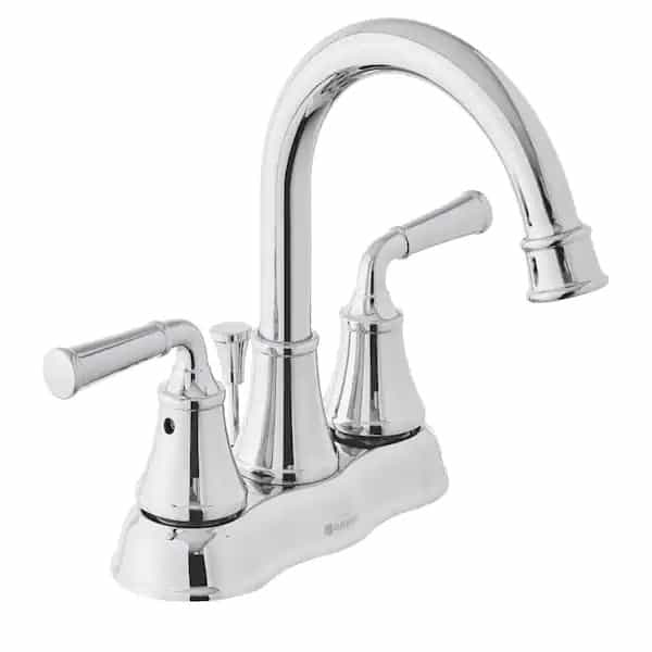 The classic style of the Dunston 4 in. Centerset 2-Handle High-Arc Bathroom Faucet in Chrome will complement any current or new bathroom decor you may have. This faucet has ceramic disc cartridges which help prevent drips and a 1.2 GPM flow rate. The metal lever handles are easy to control and the sleek high arc spout allows plenty of sink space for washing. Also included is the exclusive Glacier Bay Clickinstall drain assembly for quick and easy installation.