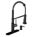 The look of a commercial style faucet with the open-coil spout adds an industrial touch and will complement your modern kitchen. The Glacier Bay Gage Coil Spring Neck Pulldown Sprayer Kitchen Faucet with TurboSpray, FastMount, and Soap Dispenser in Matte Black is just what you need to update your kitchen. This faucet boasts a single-handle design and a distinctive matte black finish. It also houses a convenient pull-down spray wand with 2-spray modes; aerated spray and TurboSpray which provides a stronger spray pattern to clean pots, pans and other dishes. A ceramic disc cartridge offers drip-free performance and a 1.8 GPM flow rate. The exclusive FastMount mounting system makes installation quick and easy. This faucet includes a soap dispenser and can fit on 1,2,3 or 4-hole sinks.