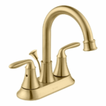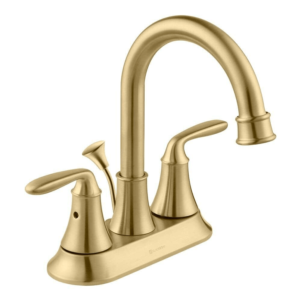 Enhance your bathroom interior with the Glacier Bay Sadira 4-in. Centerset Bathroom Faucet. It provides a double-handle design and a high-arc spout for easy operation and ample sink space. The ceramic disc cartridges deliver drip-free use. For a convenient installation, this faucet offers ClickInstall drain assembly. The matte gold finish creates a unique look.