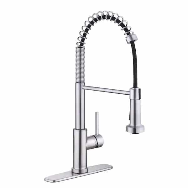 The Glacier Bay 100 790 7578 Paulina Single-Handle Spring Neck Pull Down Sprayer Kitchen Faucet in Stainless Steel is a sleek and functional addition to any kitchen. This faucet features a stainless steel finish that is both durable and easy to clean. The single-handle design allows for easy control of water temperature and flow, and the pull-down spray head provides maximum flexibility for washing dishes and rinsing fruits and vegetables. The spring neck design allows for easy reach and maneuverability, and the high-arc spout provides ample clearance for washing large pots and pans. The faucet is easy to install and fits most standard kitchen sink configurations.