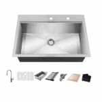 - Includes bamboo CUTTING BOARD, deep STAINLESS STEEL COLANDER, and dish-drying ROLL-UP RACK that slide on the ledges converting your sink to a workspace. Also included in box: Sink, Bottom Rinse Grid, Strainer Drain, Cutout Template, Mounting Clips and Installation Manual