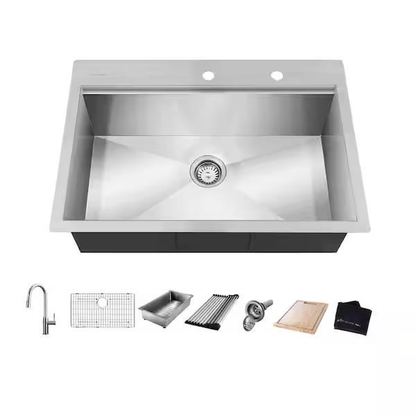 | Features: | Corrosion Resistant, Insulated, Sound Dampening, Tight/Zero Radius, Workstation | Includes: | Bottom Grids, Colander, Cutting Board, Faucet, Mounting Hardware, Rolling Drying Rack, Strainer, Strainer Basket |