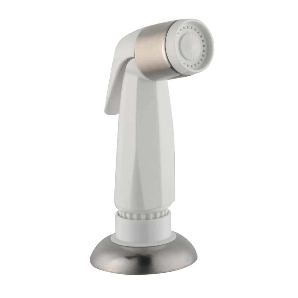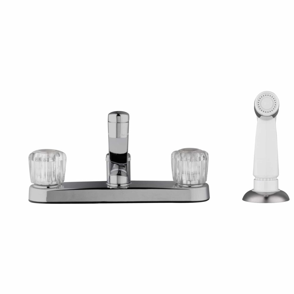 The Glacier Bay Aragon 2-Handle Side Sprayer Kitchen Faucet in Chrome complements a wide variety of kitchen decor. Combining simple design with convenient functionality, this faucet features separate hot and cold durable acrylic handles that make precise control of water temperature a breeze. The handy side sprayer simplifies washing dishes, pots and pans and clearing the sink, while the bright chrome finish is easy to maintain and clean. Pair with other pieces from the Aragon Collection for a complete and polished look. Limited Lifetime Warranty.