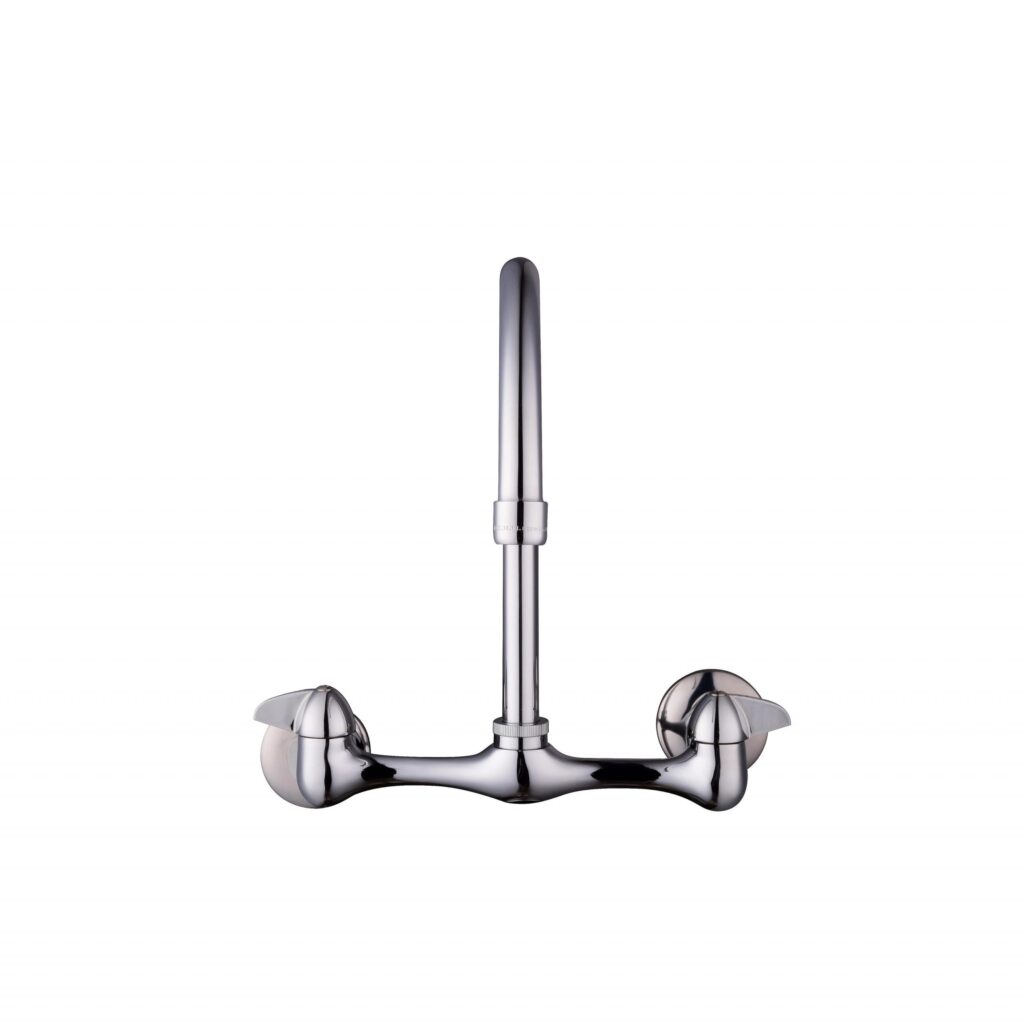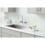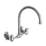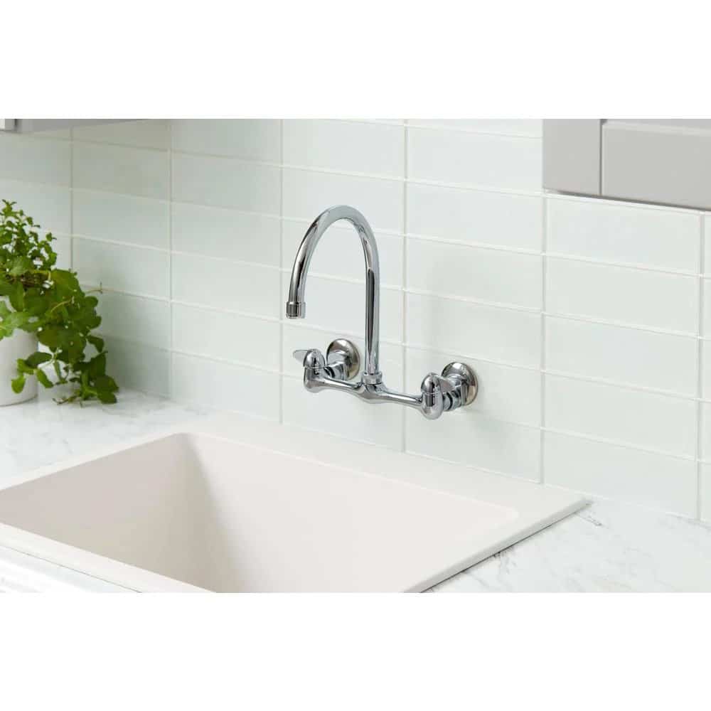 The Glacier Bay 2-Handle Kitchen Faucet in Chrome features a unique wall-mount design that enables you to install it regardless of your sink’s existing fixture holes. Its design also saves you counter space. This faucet is equipped with an elegant high arc spout.