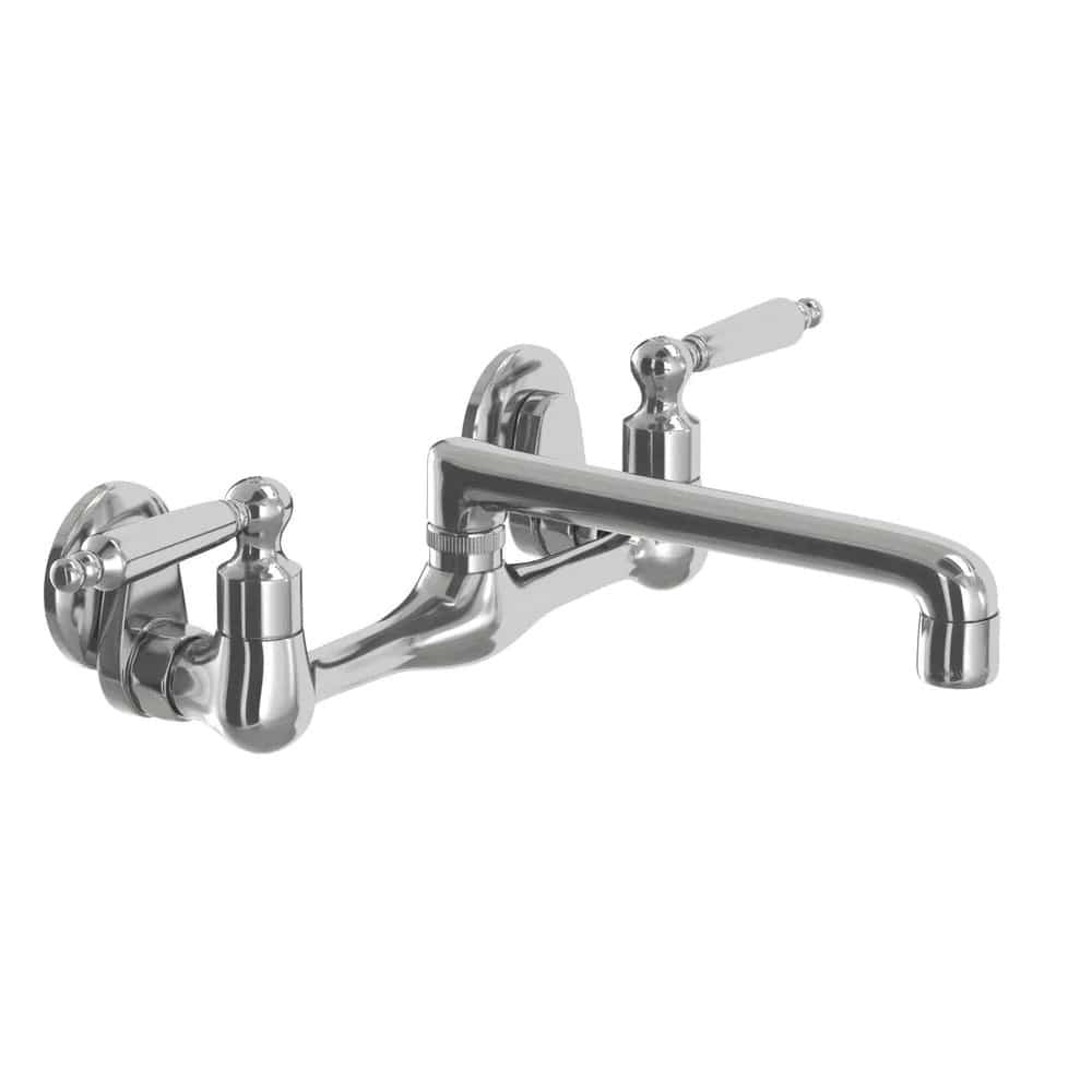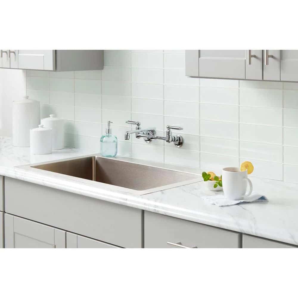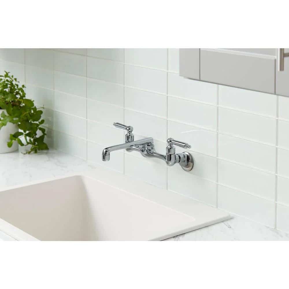 The Glacier Bay 2-Handle Kitchen Faucet in Chrome features a unique wall-mount design that enables you to install it regardless of your sink’s existing fixture holes. Its design also saves you counter space, while its long handles allow for easy use. This faucet is equipped with an elegant high arc spout and 7-9 in. adjustable center distance for versatile installation and hookup.