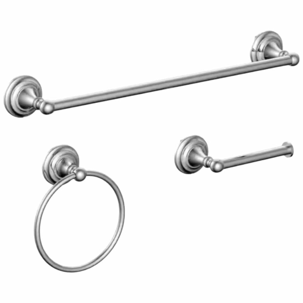 The Tennyson 3-Piece Bath Accessory Kit in Chrome includes a toilet paper holder, towel ring, and 18 in. towel bar. Its traditional design fits seamlessly into most bathroom decor, while durable zinc construction ensures long-lasting use.