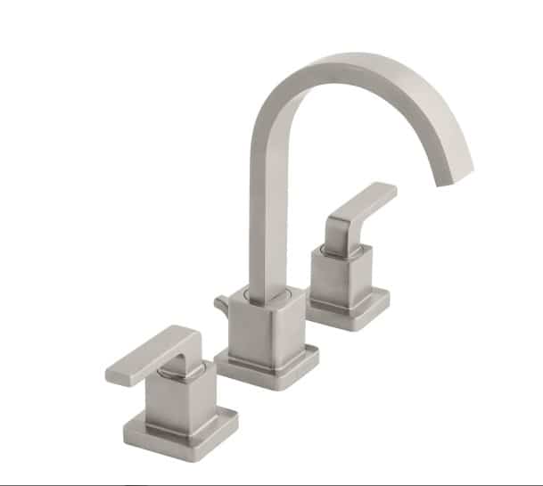 Update your bathroom while conserving water with this Farrington 8 in. Widespread 2-Handle Hi-Arc Bathroom Faucet from Glacier Bay. This WaterSense certified faucet has a 1.2 GPM flow rate that helps reduce water use and ceramic disc cartridges that prevent drips. Its simple modern design and brushed nickel finish complement any bathroom decor. The stylish handles give you easy water flow and temperature control while the high-arc spout provides plenty of washing space.
