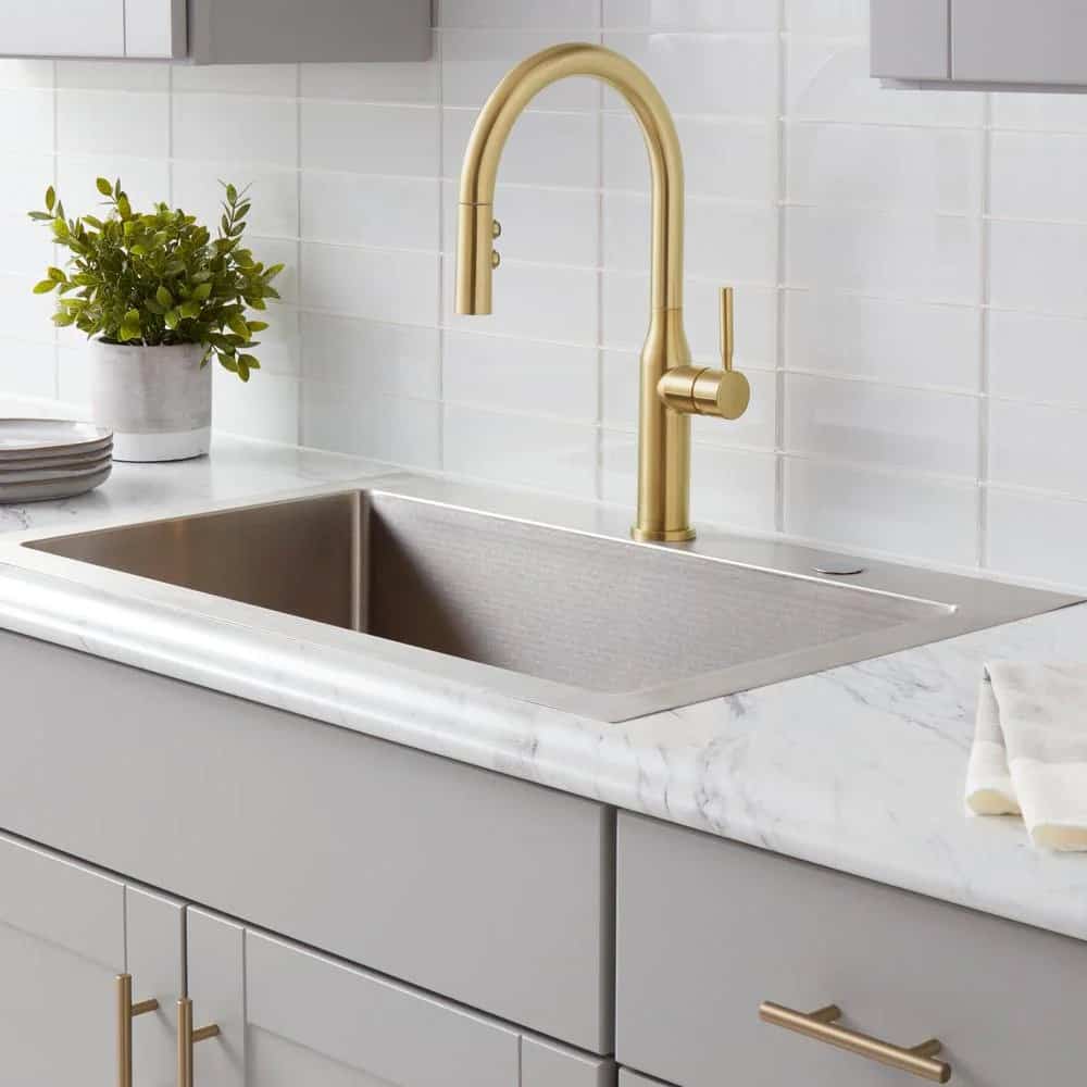 The Glacier Bay Upson Single-Handle Pull-Down Sprayer Kitchen Faucet in Matte Gold is a sleek design sure to inspire. This faucet features a unique look and easy functionality. The 2 function sprayer allows for full spray and aerated spray, perfect for everyday cleaning. The 1.8 GPM flow rate provides excellent water pressure and the ceramic disc valve ensure drip-free performance. Easy to install, this faucet will meet all your faucet needs.