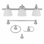 Globe Electric’s 5 Piece Estorial All-In-One Bath Set is a wonderful way to update your bathroom with one easy step. Complete with a 3-light vanity fixture, towel bar, towel ring, robe hook and toilet paper holder in brushed steel your bathroom will look streamline and welcoming. Add a compatible dimmer switch to your vanity fixture to create a warm ambiance for a relaxing bath. While the pieces complement each other you can split this set up and use it throughout your home. The towel bar makes an excellent shoe holder. The towel ring would be great in your kitchen. The vanity light would work in your bedroom. Think outside the box. Three A15 60-Watt bulbs are required and sold separately.