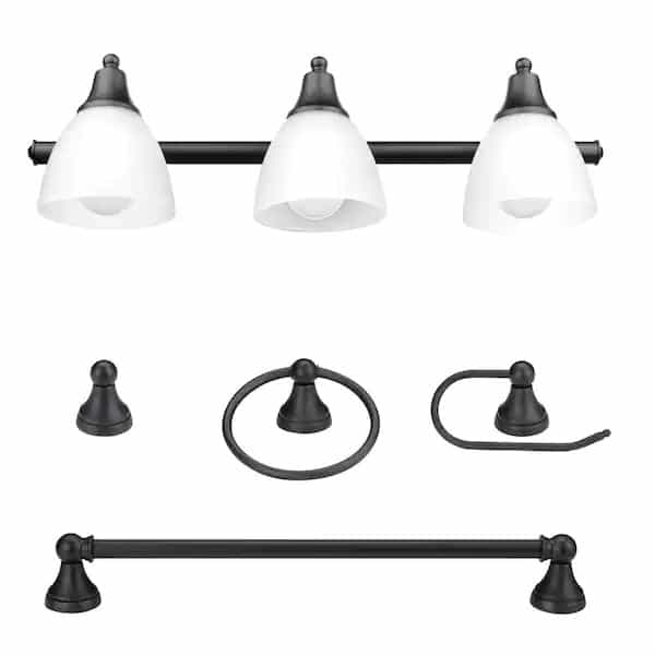 Globe Electric’s 5-Piece Jayden All-In-One Bath Set is a wonderful way to update your bathroom with one easy step. Complete with a 3-light vanity fixture, towel bar, towel ring, robe hook, and toilet paper holder in oil rubbed bronze your bathroom will look streamline and welcoming. Add a compatible dimmer switch to your vanity fixture to create a warm ambiance for a relaxing bath. While the pieces complement each other you can split this set up and use it throughout your home. The towel bar makes an excellent shoe holder. The towel ring would be great in your kitchen. The vanity light would work in your bedroom. Think outside the box Requires three medium based 60W bulbs (sold separately).