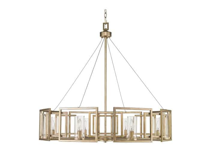 Sleek angles, pure geometry, and industrial finishes synergize to make an ultra-modern statement in Golden Lighting’s Marco collection. A soft White Gold finish heightens the light airy look of the collection, while Clear Glass cylinders surround the stately silhouettes of candelabra bulbs. This 8-light chandelier creates a dramatic focal point graciously sized for taller living and dining areas.
