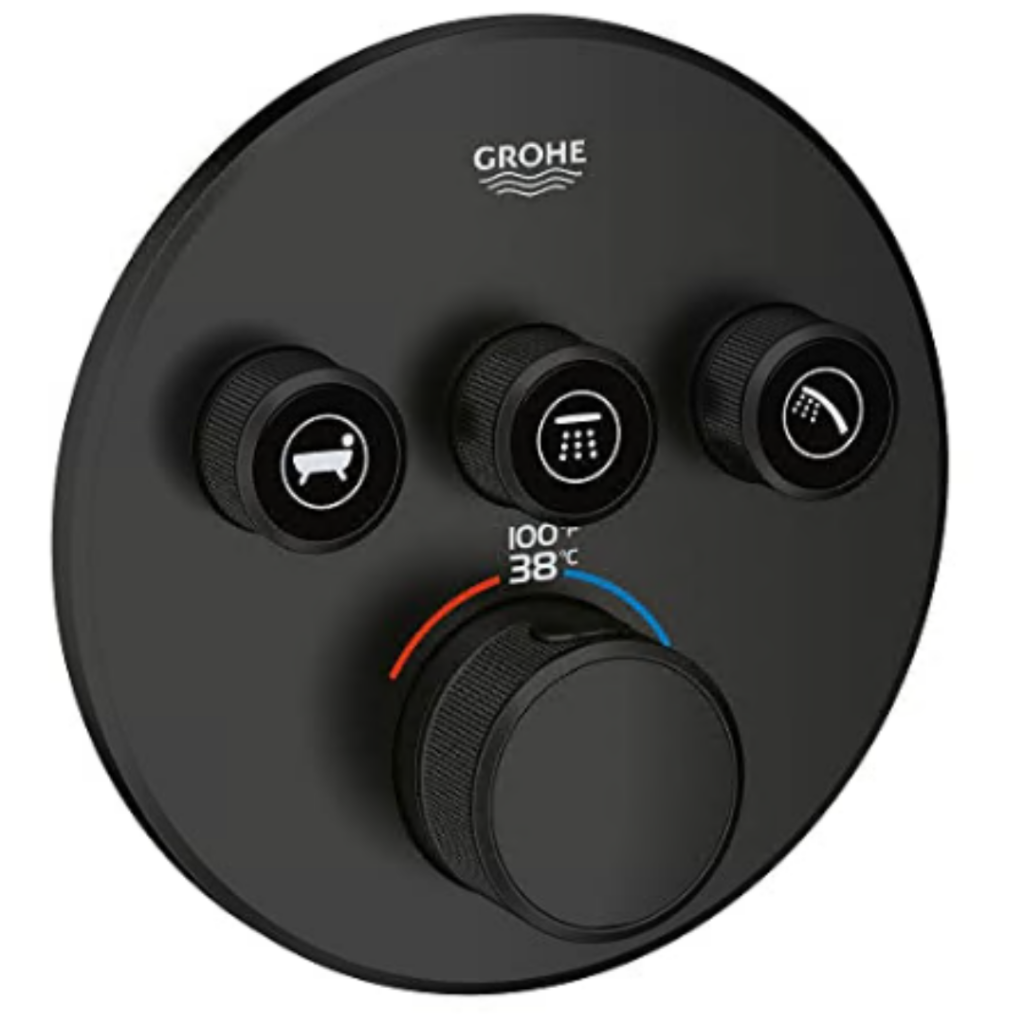 The Grohe 29 138 Grohtherm Triple Function Thermostatic Valve Trim features a modern, minimalist design that enhances any contemporary bathroom. Designed for use with the Grohe Rapido Smartbox (sold separately), this trim incorporates SmartControl technology, allowing you to select spray sources and adjust water volume with a simple push-and-turn motion. The three integrated valves provide full flexibility—control, switch between, or combine multiple spray patterns and outlets as desired.
