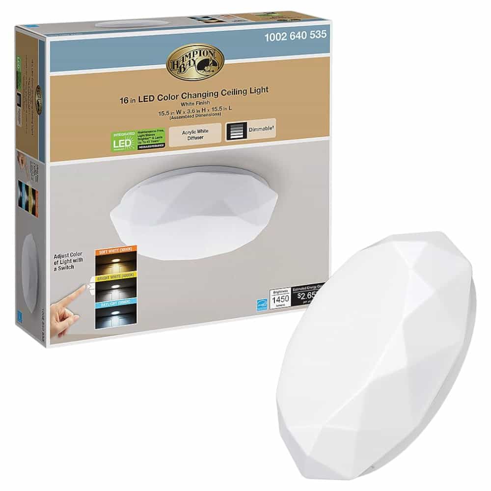 The Hampton Bay 16 in. Diamond LED Flush Mount Ceiling Light adds a touch of modern style to any space while delivering efficient, high-quality illumination. It produces 1,450 lumens of bright light while using up to 79% less energy than traditional 100-watt incandescent bulbs. Designed to last more than ten times longer, this eco-friendly fixture helps reduce electricity costs and maintenance with its long-lasting LED technology. Its lightweight construction allows for easy installation, making it a versatile choice for kitchens, bathrooms, hallways, stairways, closets, basements, or retail areas.