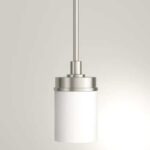 The Hillcrest Collection features interior lighting with straight lines and push-button style knobs. The Hillcrest mini pendant brings contemporary styling to kitchen and dining room areas. The combination of a brushed nickel finish with frosted glass provides a pleasing look that will coordinate well with a variety of interior décor styles from modern to minimalist. The single, down light bulb is shaded by a white, frosted glass cylinder that is open at the bottom to allow easy access to change the bulbs. The frosted glass evenly distributes the light for a warm illumination while the metallic nickel reflects the glow. This contemporary pendant light looks great as a single piece or can be hung as multiples along a kitchen island or dining room table. The hanging rod attaches onto the ceiling canopy with a hook, allowing this pendant to be hung on a sloped ceiling.