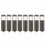 Each of these 8 Hampton Bay Low Voltage 10-Watt Equivalent LED Bollard Path Lights shines brightly and is long lasting. It creates light similar to a halogen light, but uses over 80% less energy. It has a rated life of 50,000 hours and is virtually maintenance free, with no bulbs to change. The metal construction, powder coat finish and weatherproof electronics ensure it will serve for a long time. There is a quick-install wire connector with a cleated heavy-duty stake, making it quick, easy and safe to install. Light is directed toward the ground, to make a beautiful pattern of soft light that can illuminate steps, pathways and smaller plants. It’s also a good security feature.