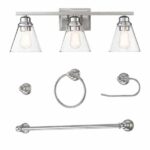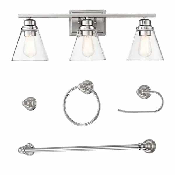 With a brushed nickel finish and clear glass shade, this 3 light vanity light brings brightness to your bathroom with a unique style. The towel bar, towel ring, toilet paper holder and robe cover are all in 1, bringing a modern and sophisticated vintage look. Attached to the plate is a straight horizontal arm with 3 thick clear glass shades to resist the humid environment in your bathroom. Easy to install. Each shade can accommodate 1 incandescent bulb up to 60-Watt (bulb not included), it is compatible with dimmer switches to create a warm ambiance in your bathroom from morning to night for a relaxing bath.