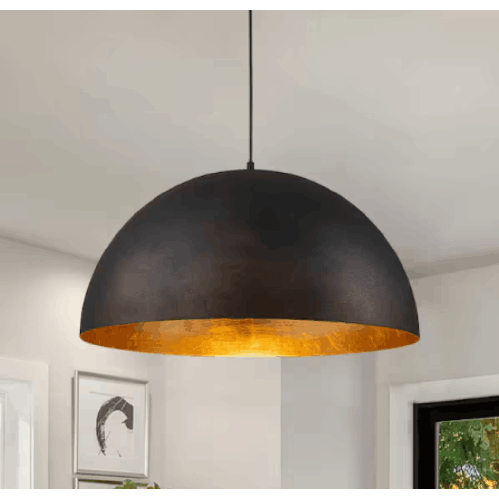 Make a statement with this bold 23.6 in. industrial-style pendant light. The exterior features a textured orange peel effect in matte black for a striking modern look, while the hand-applied gold leaf interior enhances warmth and elegance. Designed to complement industrial, rustic, and contemporary spaces, this fixture blends style with functionality. It accommodates an E26 bulb (max 60W) and includes a fully adjustable 7.2 ft. cable, making it suitable for various ceiling heights, including sloped and vaulted ceilings. Perfect for kitchens, dining areas, and entryways, this pendant light adds a sophisticated touch to any space.