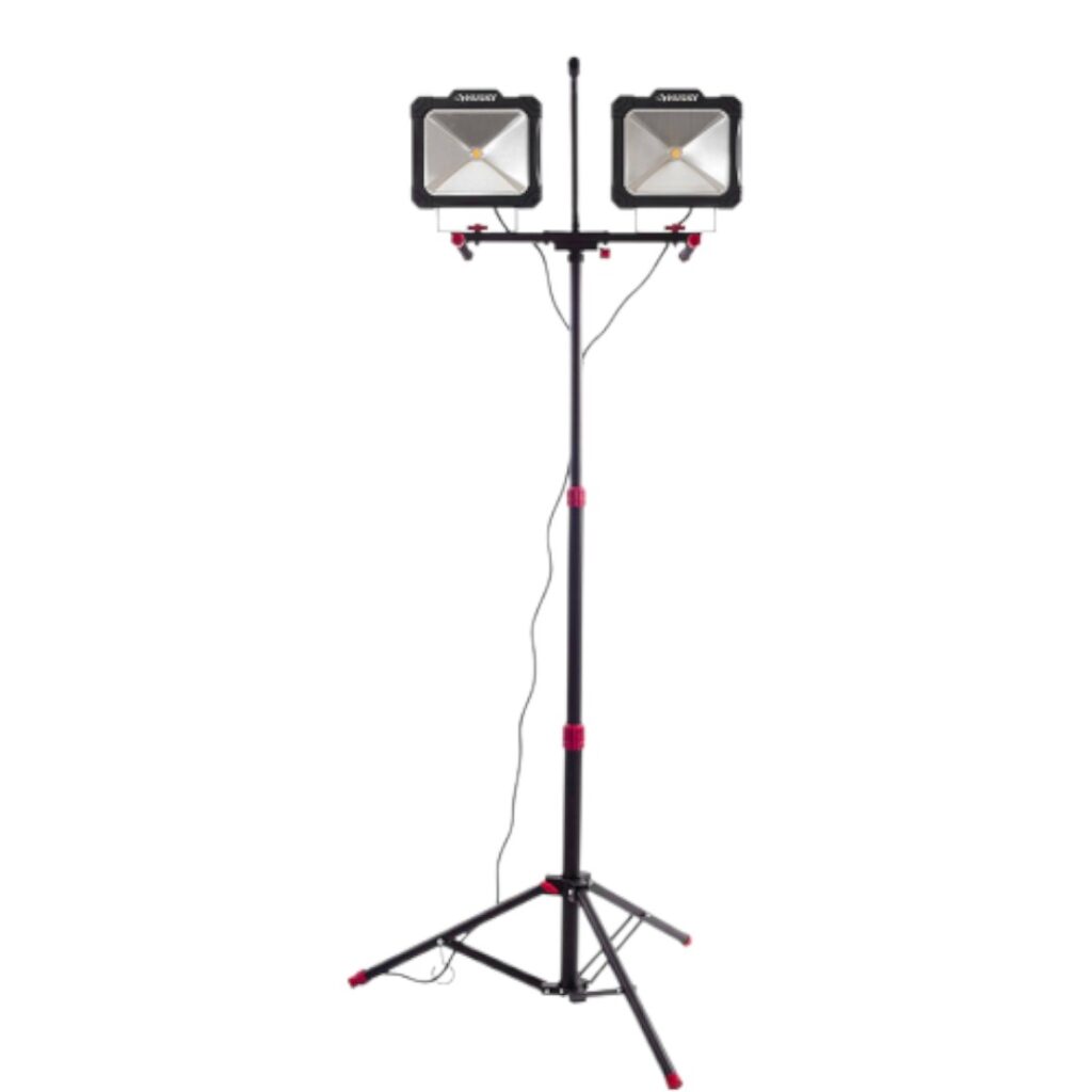 The Husky 10,000 Lumen Twin Head LED Work Light delivers bright, reliable illumination and can be used with or without the tripod. Its durable LED bulbs provide long-lasting lighting, and the detachable design with an easy-grip handle allows for convenient portability.