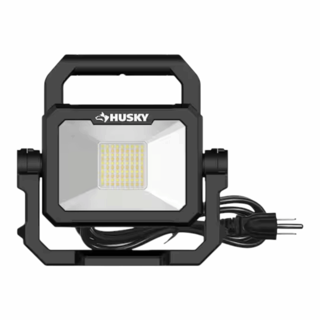 The Husky 3,000 Lumen Corded Work Light is designed for tough job site conditions, providing bright, reliable illumination. Its rugged hinge and anti-pinch handle ensure safe and easy handling, while foldable stands with integrated wire wrapping offer compact, convenient storage. The light head rotates up to 300° with audible clicks every 10° for precise aiming, and the adjustable stands open to 120° with ratcheted increments to customize your lighting angle. With a wide 100° beam and a tactile switch for quick control, this work light delivers consistent coverage. The IP65-rated housing protects against dust and water, ensuring dependable performance in demanding environments.