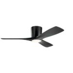 The KICHLER Volos 48 in. Satin Black LED Fan features an integrated LED lamp that serves as an ambient downlight. It has a unique design with a satin black finish that complements various styles of decor. This ceiling fan comes with a 65K wall control that allows for precise fan speed adjustment.