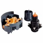 - Kit includes valve body, pressure-balance cartridge, rough-in guide, and mud guard
