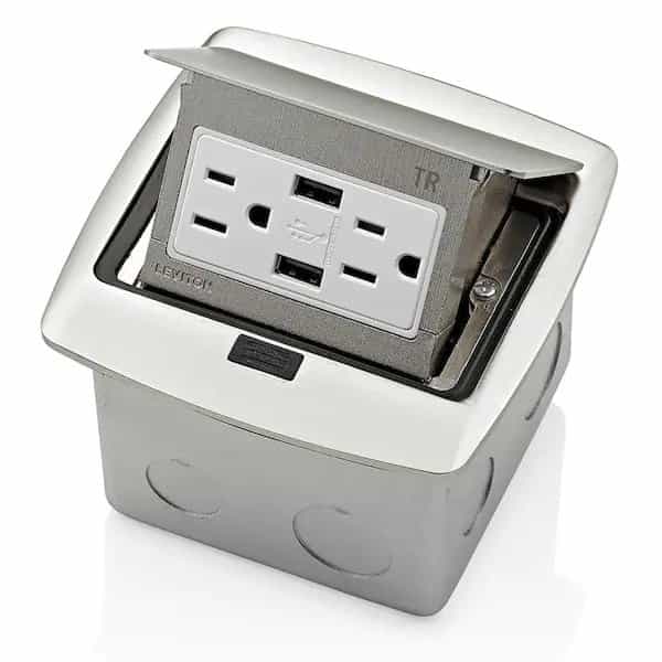 The Pop-Up Floor Box Receptacle offers a modern, practical way to attractively conceal electrical wiring devices in homes and businesses, while still providing accessibility to power when needed. Featuring a sleek low profile and stylish metal cover that recesses neatly into the floor when not in use, it takes only the press of a button to make the receptacle available. The Pop-Up Floor Box Receptacle may be used to satisfy the appropriate code requirements for residential and commercial applications; it also offers protection from ingress of water spray when closed and meets or exceeds scrub water test for safety.