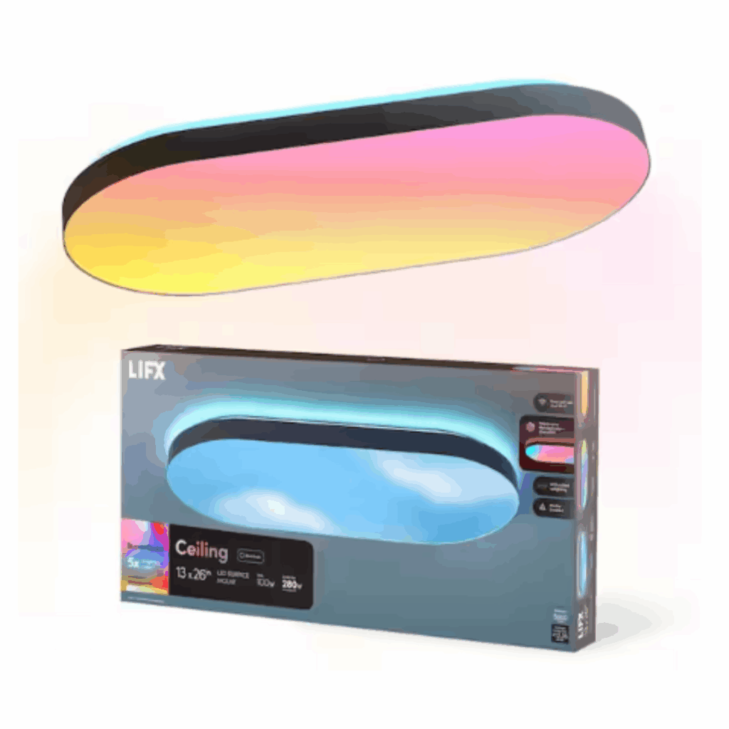 The LIFX PolyChrome 13 in. x 26 in. Oval Ceiling Light combines advanced smart lighting with a sleek black trim flush-mount design. Featuring billions of colors and an extensive white range (1500K – 9000K), this ceiling light creates the perfect ambiance for any occasion. No hub required—control it via the LIFX app, voice assistants, or Matter-compatible smart home systems. Enjoy dynamic lighting effects, schedule automation, and uplight control for nighttime visibility.
