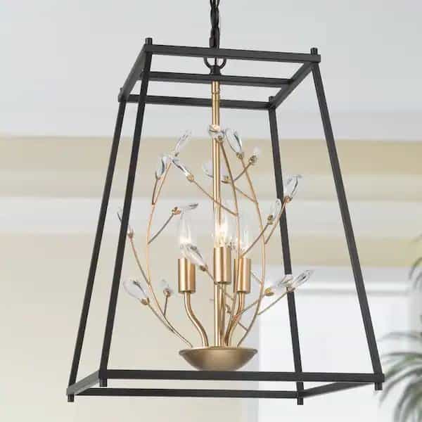 The most attractive thing about this modern chandelier is the design concept. Inside the hard metal cage is a thriving branch with crystal leaves of beauty, purity, and fragility. The cage guards the seedling just as the little prince loves the rose and just as you have always been firmly guarding your original aspiration and cherished family. In addition, this modern black chandelier by LNC complements a variety of home styles and decors. It perfectly blends elegance with vintage. The gold curvy branches and matte black linear cage give the space brand new energy that never disappoints you. Hand-treated rectangle cage shade showcases an on-trend industrial taste while the 3 candle lights (not included) bring a classic flair and a warm glow to your home. The modern farmhouse chandelier pendant light is a perfect option for brightening up your kitchen island, dining room, bedroom, living room, hall, foyer, entryway, and more. It has a metallic luster and can bring different craft styles to your house. The unique shape and superb craftsmanship make you have a superior experience.