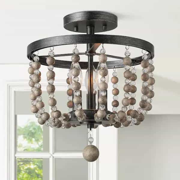 - Beaded Ceiling Light: With a unique take on Bohemian Style elements, this semi flush mount ceiling light modernized the rustic farmhouse trend with a rich graphite painted finish and handcrafted wood & crystal beads