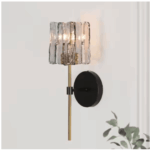 The LNC Echonalyri Modern 1-Light Wall Sconce combines contemporary elegance with a touch of glamour. Featuring a geometric textured glass shade crafted from grey crystal plates, this fixture creates a stunning lighting effect. The sleek black and brass metal frame enhances its modern aesthetic, making it a stylish addition to any space. Perfect for bathrooms, powder rooms, living rooms, bedrooms, foyers, and more, this sconce effortlessly elevates your decor.