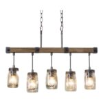 Make a statement in any space with this modern farmhouse 5-light linear chandelier. Perfect for hanging above a dining table or kitchen island, it features a metal frame with a faux dark wood grain and rustic black finish. Five mason jar shades hang from the linear base, casting a warm, inviting light while adding a touch of farmhouse and vintage charm. This stylish chandelier complements modern farmhouse decor and highlights your space with eye-catching appeal.